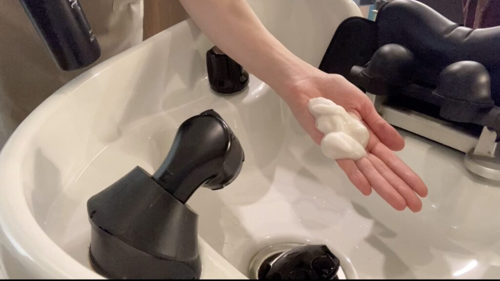 こんな感じのコーラみたいな色をした黒い液体をフォーム状にしてカラー後の髪と頭皮に塗布していきます。