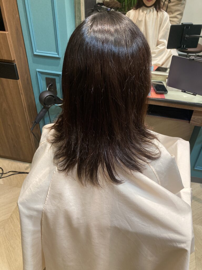 毛先はまだカラーの時の履歴が残っています。根元と毛先の質感の違いが一目瞭然。